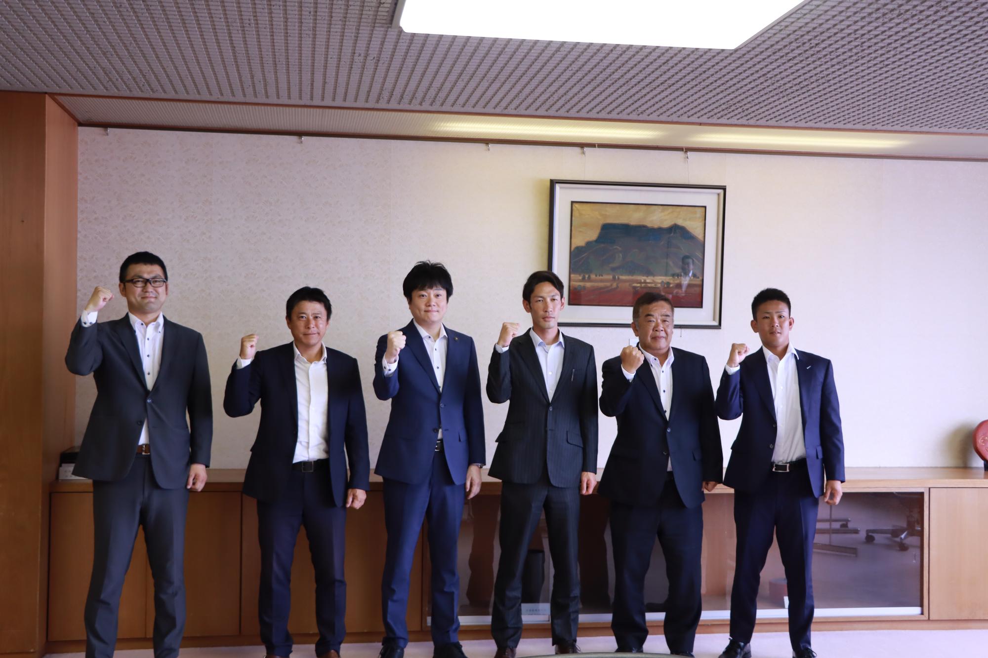 6月17日(月曜日)に伏木海陸運送硬式野球部の選手らが、第95回都市対抗野球北信越地区大会の優勝を報告するため、市役所を訪れました。7月19日に東京ドームで行われる全国大会に向け、田中監督は「能登半島地震で被災された方に勇気と元気を届けられるよう頑張りたい」、水野主将は「大会に向け、より一層頑張っていきたい」と意気込みを話しました。