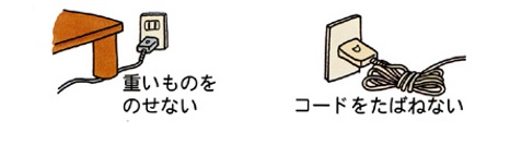 このような火災を防ぐために、普段から使用している電気器具や電源コード、コンセント、プラグ等を点検しましょう。また、普段使用していない電気器具のプラグは、コンセントから抜くように心がけてください。