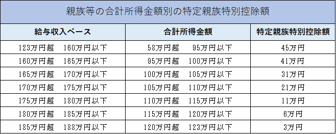 控除額は、当該親族の合計所得金額に応じて逓減(徐々に減少)します。適用される控除額は以下の表を参照してください。