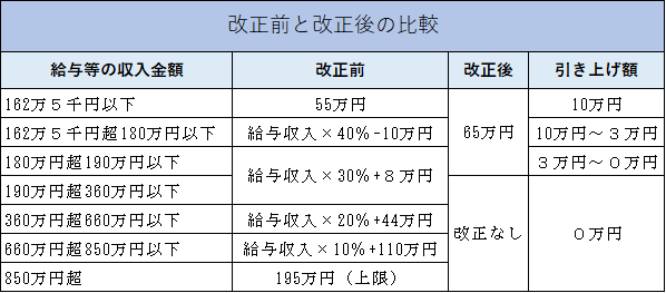 給与所得者に適用される給与所得控除について、給与収入金額が190万円以下の方の最低保障額が最大10万円引き上げられます。(給与収入が190万円を超える場合の給与所得控除額は変更ありません。)
