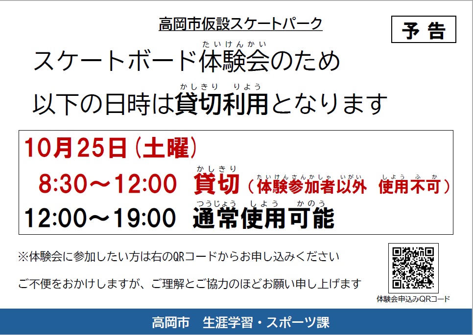 高岡市仮設スケートパークの供用開始について