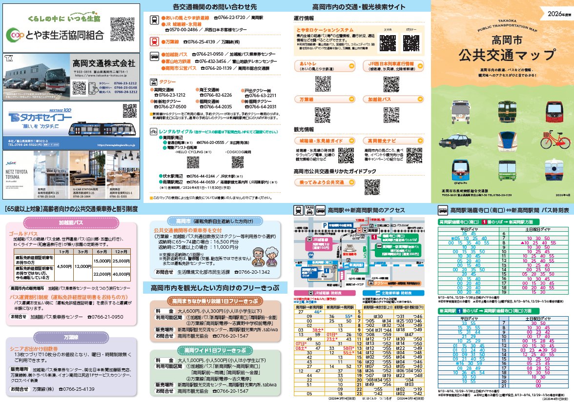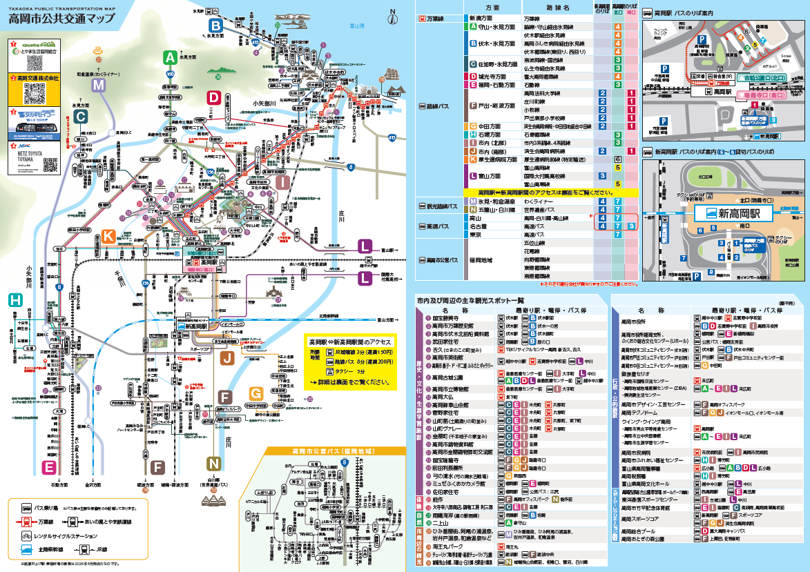 高岡市公共交通マップ 更新日:2026年04月01日 ページID : 4755 高岡市では、市民や県内外からの来訪者の利便性向上を図り、公共交通の利用促進を促すことを目的として、市内の各公共交通機関の情報や、観光地・公的施設などの最寄りの駅、電停、バス停をまとめた「高岡市公共交通マップ」を作成し、配布しています。 高岡市公共交通マップ2026年度秋版 (PDFファイル: 14.6MB) この記事に関するお問い合わせ先 総合交通課〒933-8601 富山県高岡市広小路7-50電話番号:0766-20-1139ファックス:0766-20-1414メールフォームによるお問い合わせ